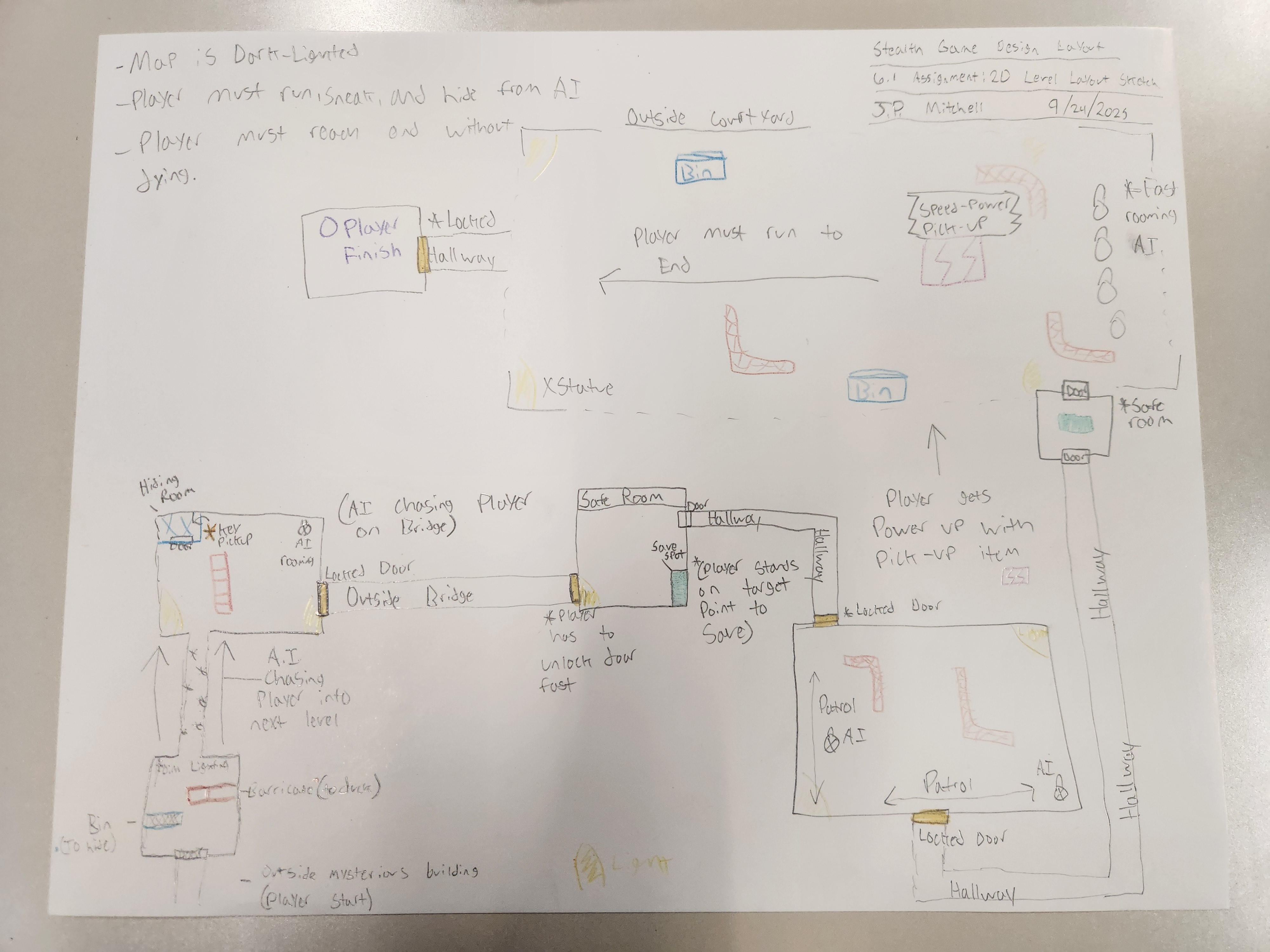 I started with the idea of a mysterious building that the player ventures into...only to encounter creatures in the dark. The player finds themselves alone in the dark, utilizing the key system to unlock doors, sneak around the enemies, trying to stay alive if caught by running and hiding, and saving throughout the level at the save rooms.